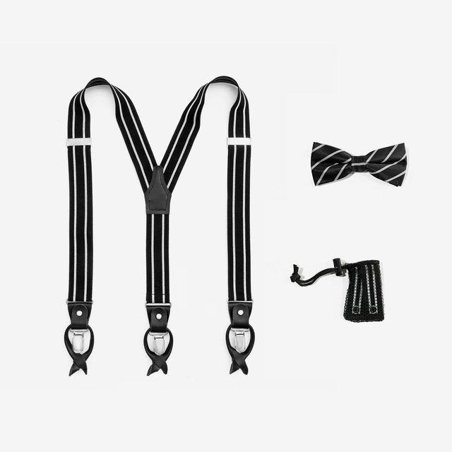 - Ein Set "Premium" enthält zwei ÄRMELANKER, einen Hosenträger inkl. 6 Clip-Knöpfe und Klemmen zur Befestigung an der Hose und passender Fliege